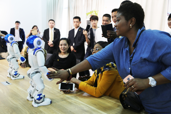 嘉宾一行观摩电子信息工程公司机器人表演
