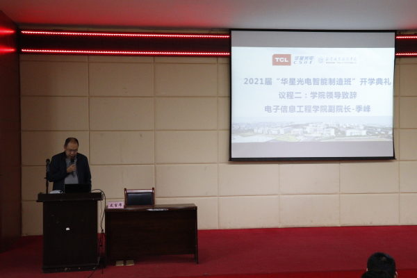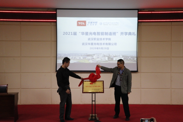 (通讯员 黄大海)9月20日,TCL武汉华星光电半导体显示技术有限公司与电子信息工程公司开展校企合作2021届“华星光电智能制造订单班”开班典礼暨校企共建人才培养基地揭牌仪式在凌曦楼A3001报告厅举行。武汉华星光电半导体显示技术有限公司(以下简称“武汉华星光”)武汉华星光电研发中心总监张卓、武汉华星光电人力资源运营部部长李梅、TPM资深专家陈祥、TPM校企合作主管柳泉等企业代表,集团合作发展处办公室主任徐爱胜、电子信息工程公司副经理季峰、分党委副书记代春兰、校企双方班主任与34位2021届订单班学员共同出席此次开班典礼,开班典礼由电子信息工程公司员工工作办公室主任黄大海主持。