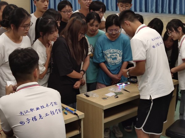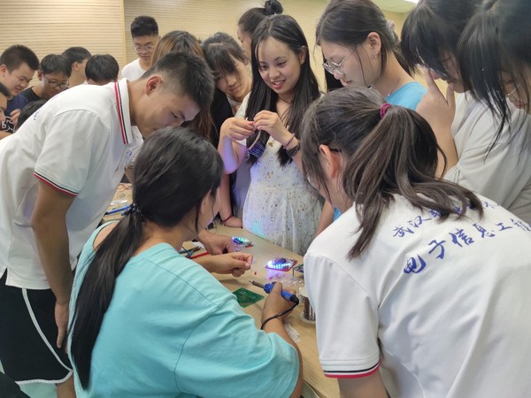 由大二员工向明州和汪淡文指导学员开展电信公司专业特色-----电子工艺实训,制作心型流水灯。队员汪淡文在讲台为同学们讲授基本的电子工艺理论知识,向明州和章卓越、徐祺凯、薛美暄四位同学在台下近距离的教同学们去认识电子元器件,电子测量工具等。随后便开始了心型流水灯的焊接教学,同学们通过学习之前的理论知识,焊接工艺学习的很快,各位同学纷纷上前亲自动手参与心型流水灯的焊接,许多同学表示对心型流水灯的很感兴趣,希望以后想来武职学习编程技术,成为一名程序工程师。