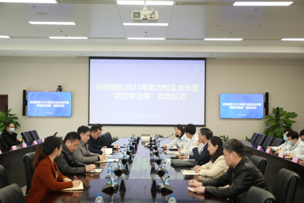 在开班仪式上,东西湖区、校企三方领导分别就企业新型学徒制的政策制度、主要内容、组织实施、保障措施等方面进行了交流和沟通。李望云表示,公司积极响应国家号召,以服务就业和区域产业发展为宗旨,充分发挥国家“双高”专业群和智能光电技术国家级教师教学创新团队优势,为学徒选派具备相应专业知识和操作技能的指导教师,结合企业生产管理和学徒工作生活实际,实行学分管理制,保证培训方案全面有效落实,全面提升学徒的岗位技能综合素质。