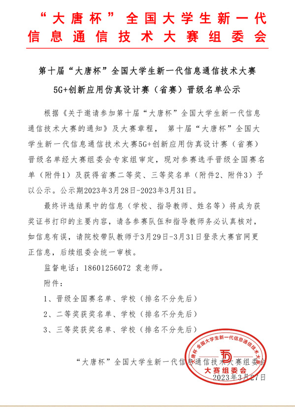 (通讯员:张帆 万夏子)2023年4月22日,从“大唐杯”官网获悉,电子信息工程公司员工获第十届“大唐杯”全国老员工新一代信息通信技术大赛湖北省赛一等奖共7项,包揽信息通信工程实践赛和5G+创新应用仿真设计赛两个赛道。