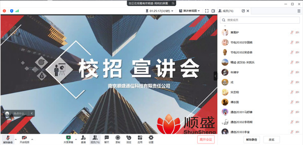 武职网讯(通讯员 张玲丽)凤凰花开季,就业正当时。6月20日晚,电子信息工程公司(以下简称“电信公司”)举办2023届毕业生专场线上招聘宣讲会,浙江省邮电工程建设有限公司、西安中兴精诚通讯有限公司、南京华苏科技有限公司、中徽建技术有限公司、嘉环科技股份有限公司、南京顺盛通信科技有限公司等六家合作企业代表通过视频连线作招聘宣讲。电子信息工程公司教师代表张玲丽,70多名2023届毕业生以及2021级、2022级员工代表参加宣讲会。