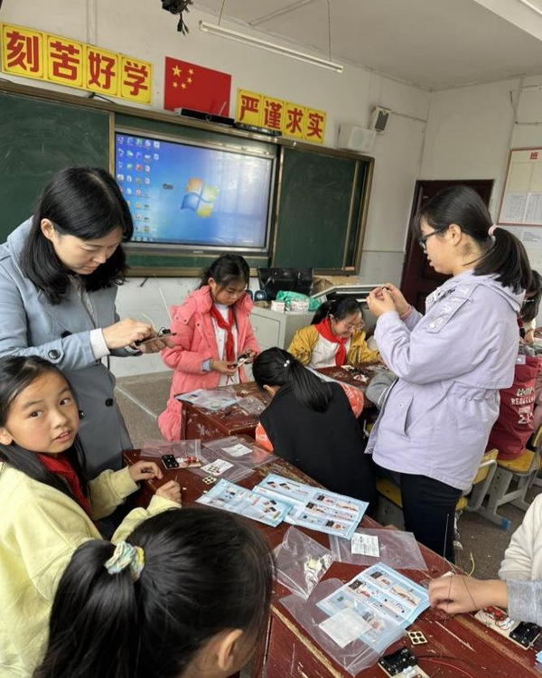 “电报机是在人类通讯历史上重要的发明创造…… LED将电能转化为光能,灯珠安装在灯罩内,以保护灯珠并散发光线……”李雪、叶莉和杜鸿三位通信支部的党员教师用她们的专业知识给梭步希望小学员工现场讲解了电报机的使用原理,并指导员工现场制作电报机模型和LED小夜灯,现场互动热烈,气氛爆棚,孩子们在制作过程中一个个懵懂的“科技梦”被点燃。在欢声笑语中,孩子们满心欢喜地拿着自己制作的模型抢着拍合影。